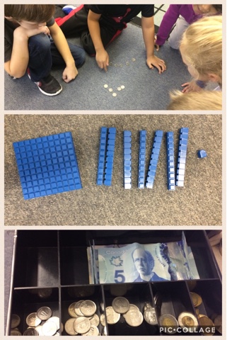 When we were back in class on Tuesday morning, we were excited to count up our money.  The grade 1s counted how many of each type of coin and bill, printed the numbers for each and then counted by 1s, 2s, 5s, 10s and 20s to determine the subtotal for each.  To calculate our grand total, a small group worked together using base ten blocks representing the dollar amounts.  Once we determined how much we had raised, our class selected books from the book drive fundraiser page and ordered them for the students in Guatemala.